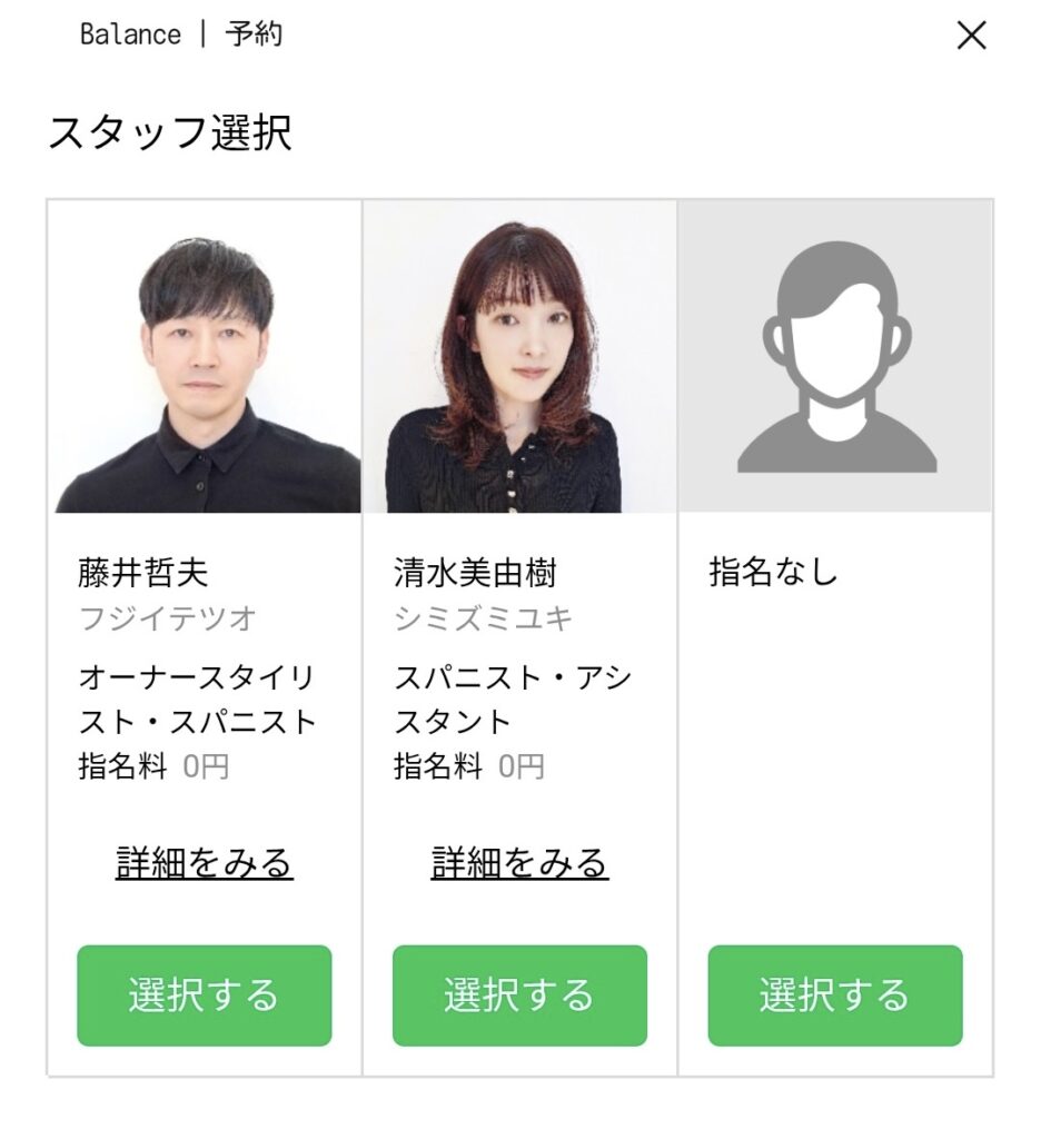 ※ 例:「カット(藤井)+ヘッドスパ(清水)」のように、メニューごとに担当者を変更することは、システムの都合上ご対応できません。