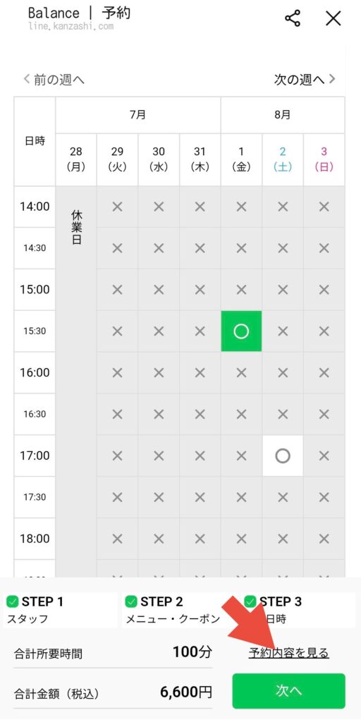 ⚫︎ここまでの予約内容を確認されたい場合は、「予約内容を見る」をタップして下さい。