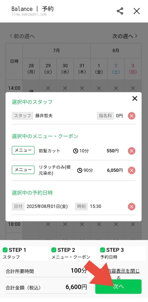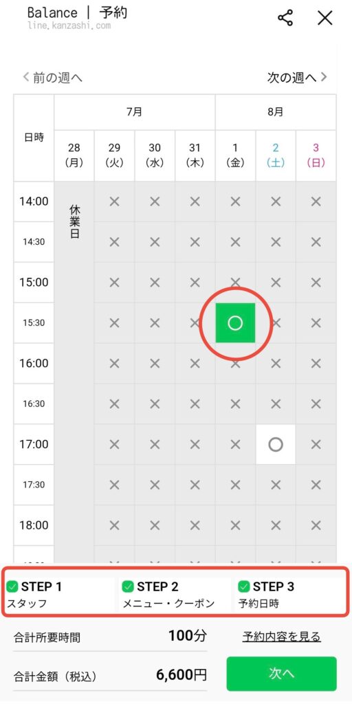 ⚫︎タップしたご希望日が緑になり、STEP3までが完了しました。