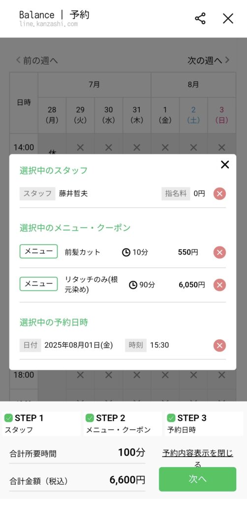 ※スタッフ選択、メニュー選択のどちらが先でも問題無いですが、メニュー選択を先にされる場合、メニューの中に「カット」「+カット」「前髪カット」を組み合わせると、指名できるスタッフが「藤井」のみとなります。それが後の「予約日時」に影響してきます。