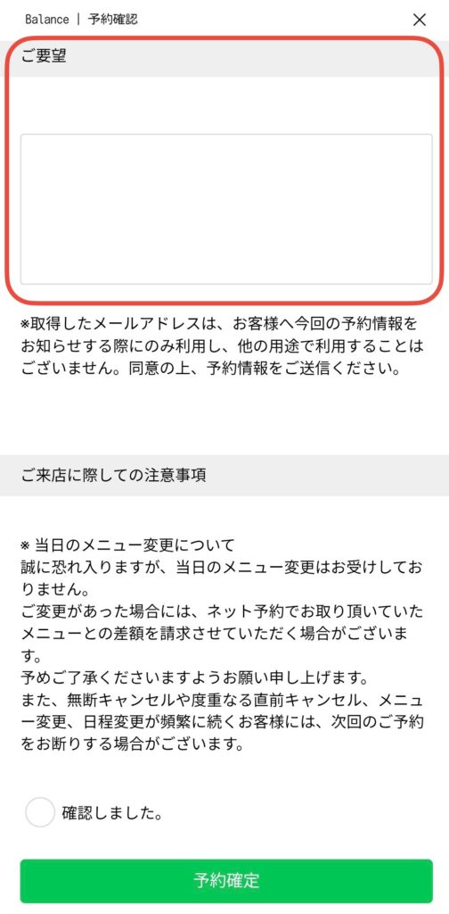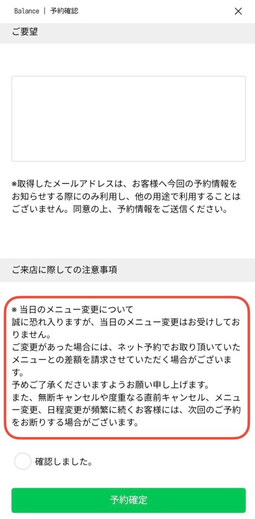 ⚫︎ご同意頂けましたら「確認しました。」をタップして頂き、最後に「予約確定」をタップして下さい。