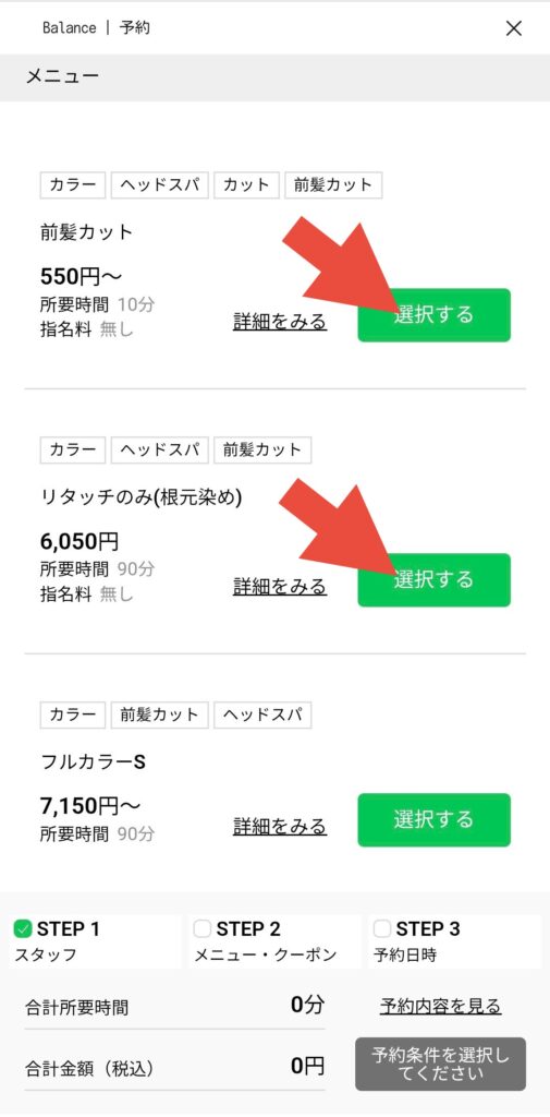 ⚫︎ご希望のメニューの「選択する」をタップ