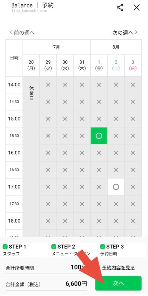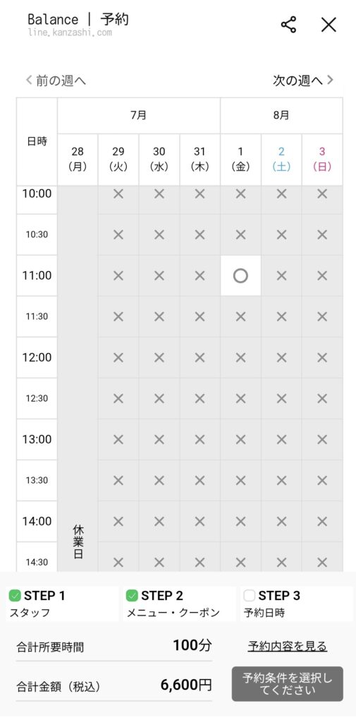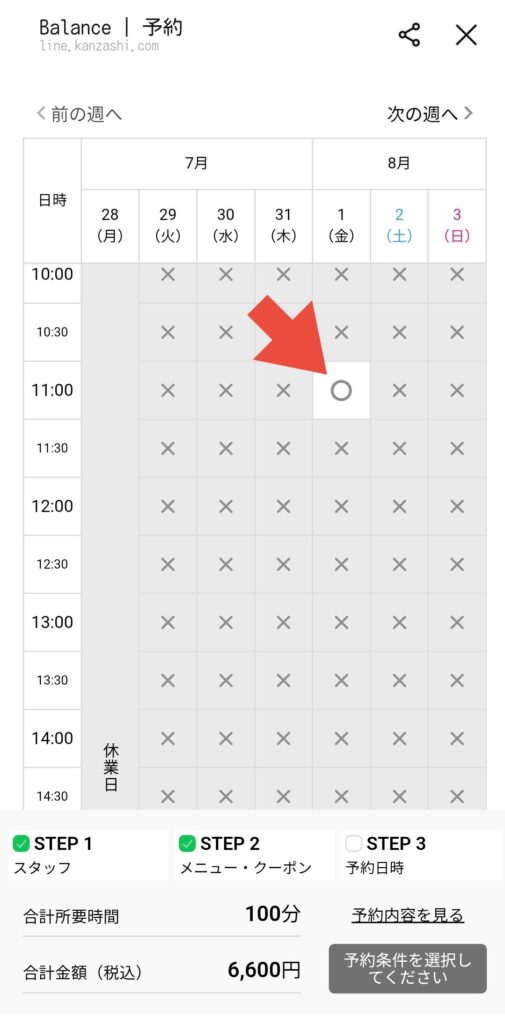 ⚫︎「○」が表示されている日時と、ご希望が合う場合は「○」をタップ。