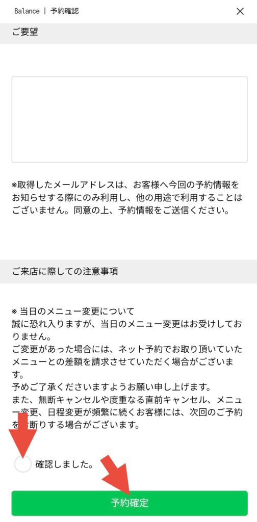 ⚫︎全てにご同意頂けましたら「確認しました。」と「予約確定」をタップ。