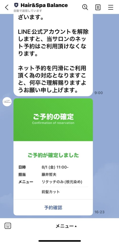 ⚫︎「ご予約の確定」というメッセージと、ご登録頂いたメールアドレスにメッセージが届き予約完了です。